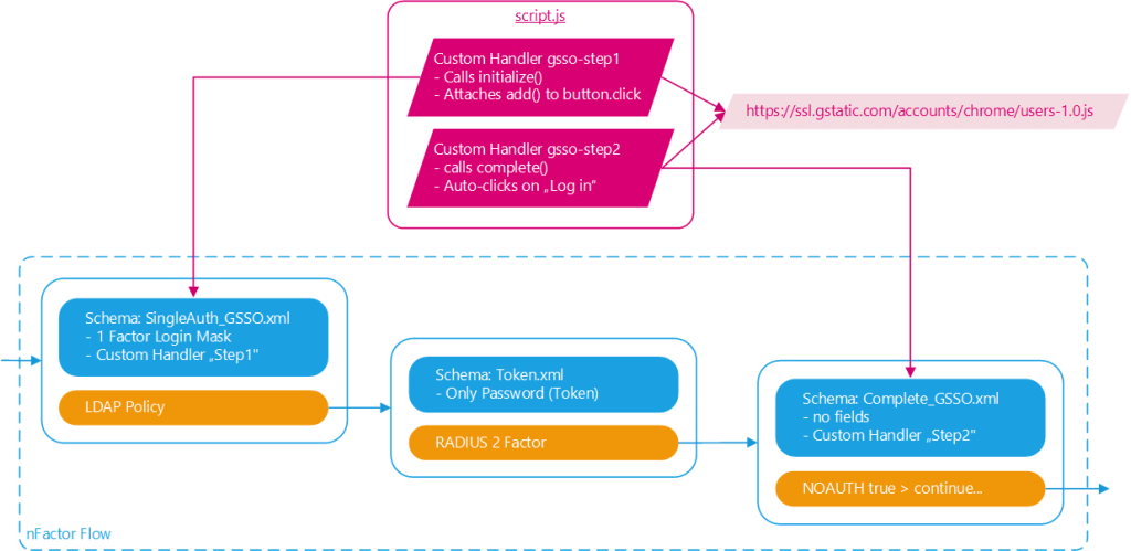 Basically I’m using two CredentialHandler. The first one for initializes the API and sends the credentials on the existing login-form. The second one is an additional “transparent” factor which completes the SSO and auto-submits the factor upon completion. A true “noschema” factor was not possible as it doesn’t allow us to execute any JavaScript.